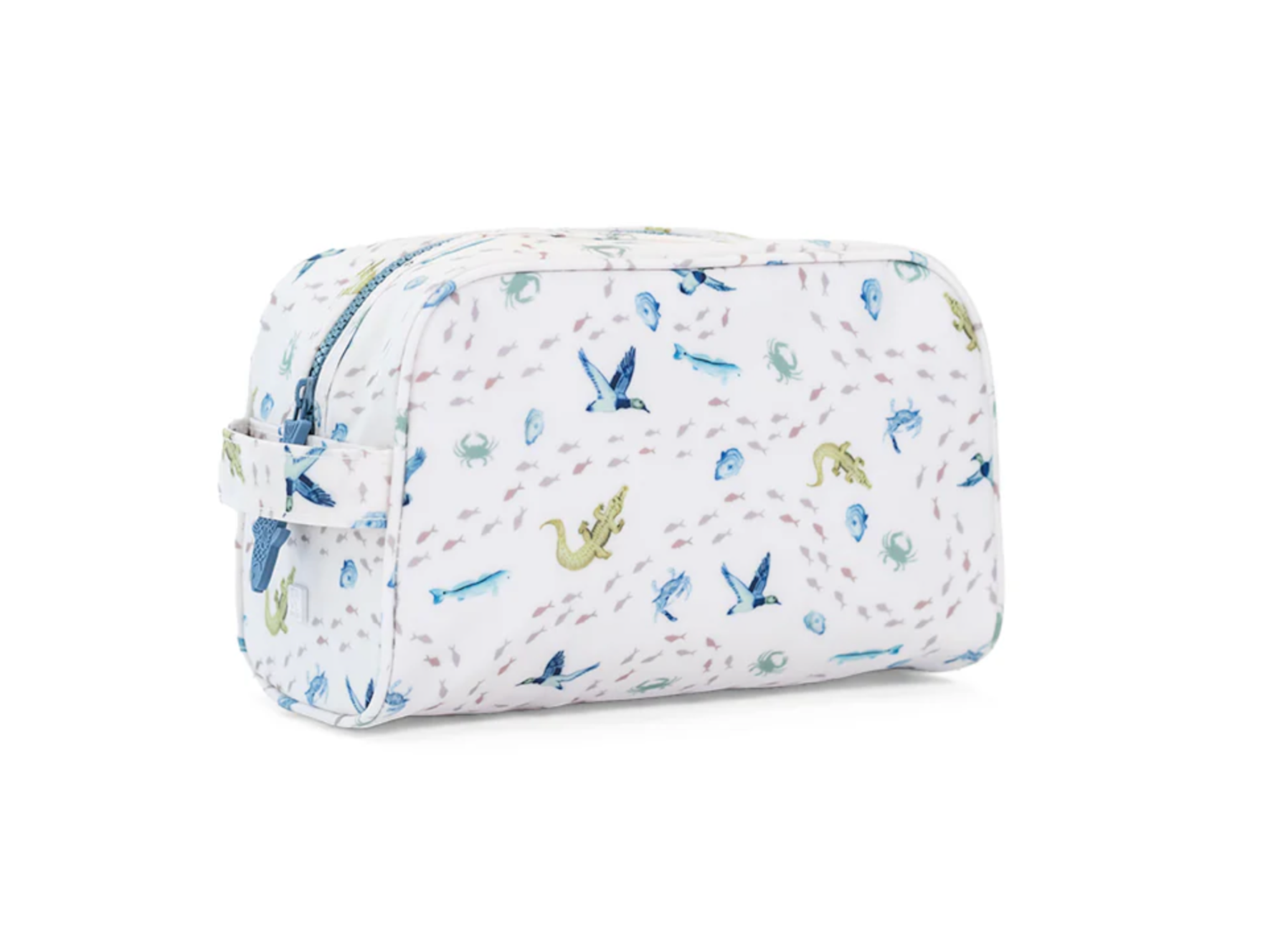 This soft yet sturdy toiletry bag is the perfect Stowaway at home or on the go! It's roomy size can store your grooming supplies, make-up, hair care, plus holds a supply of diapers and wipes.