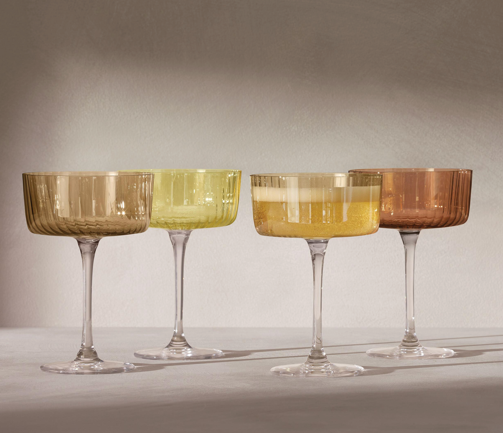A set of FOUR textured cocktail glasses with fine walls, painted by hand in assorted tonal lustres.