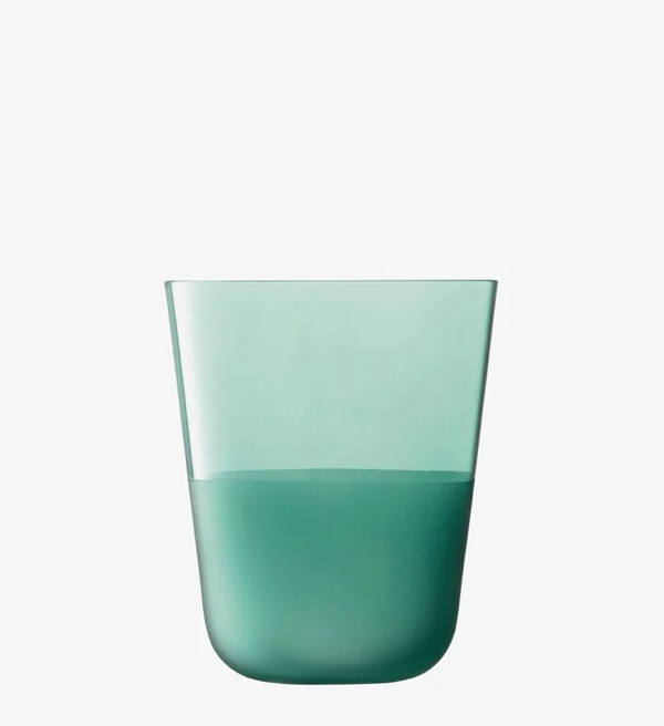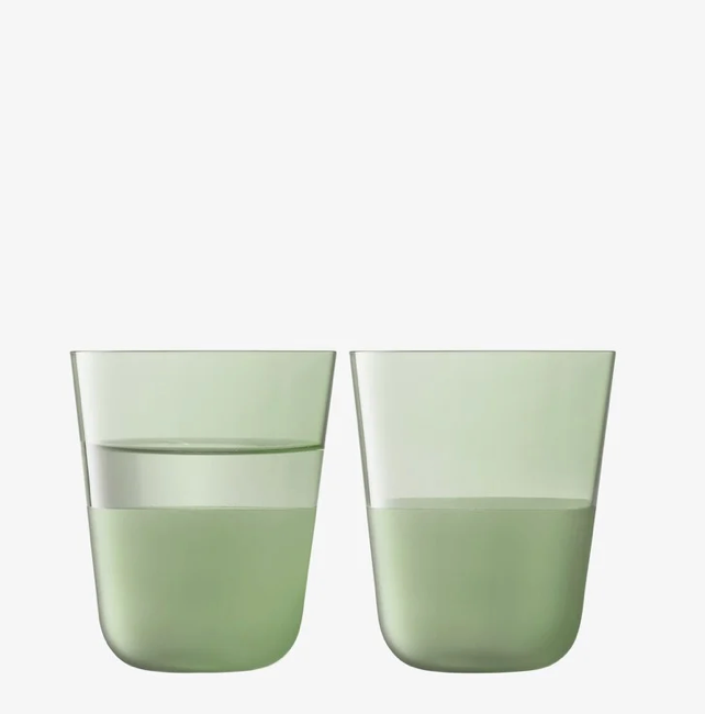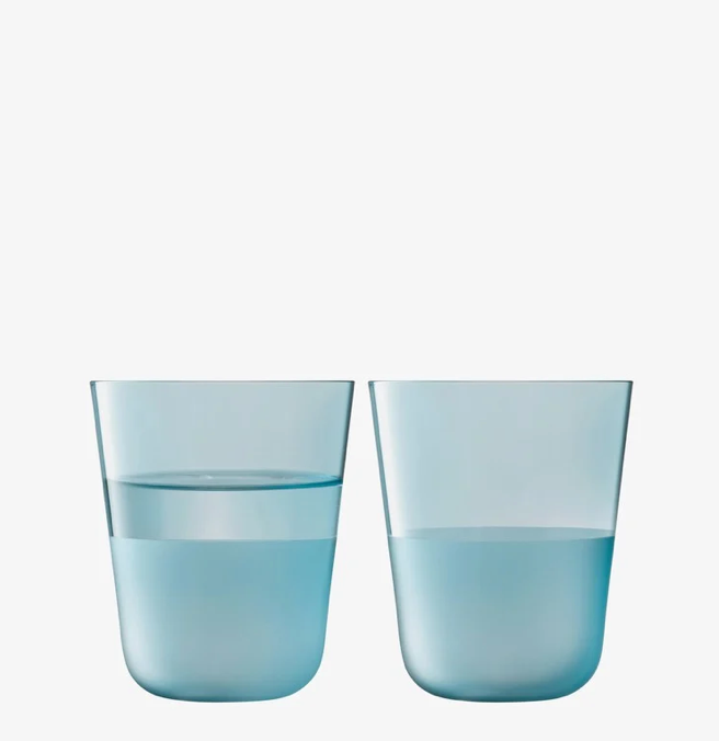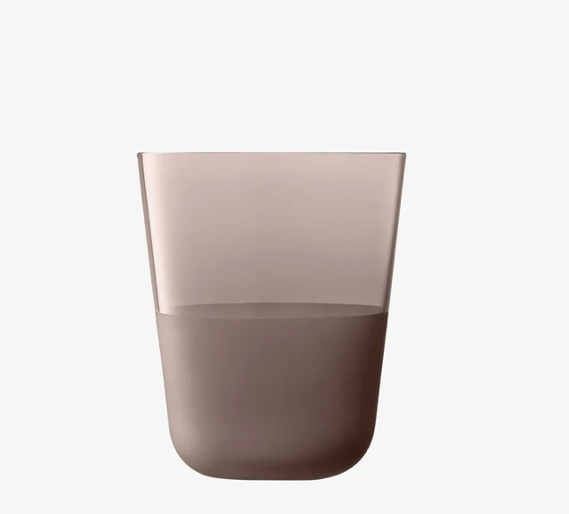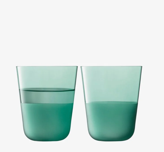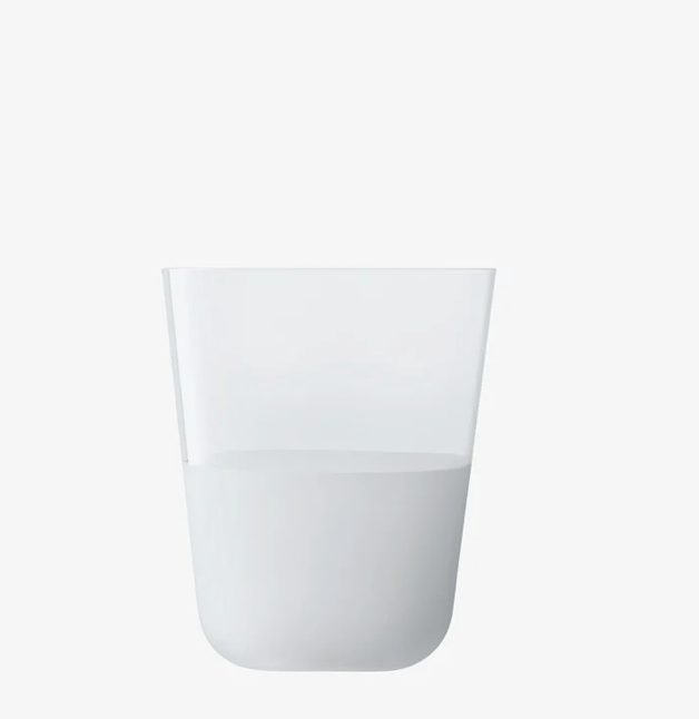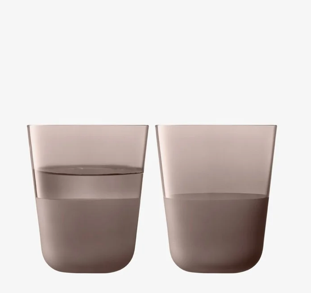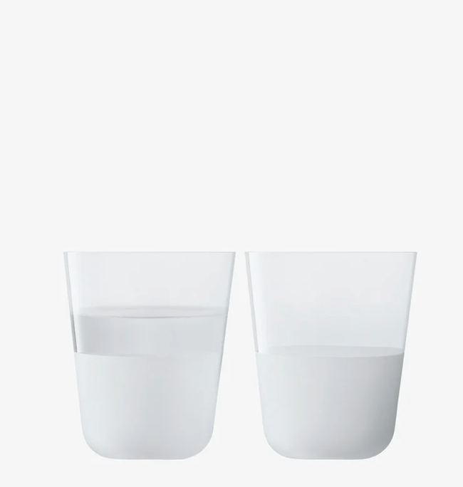 A set of two tumblers with rounded bases, softly tapered profiles, and a matte textured finish to the lower half. A versatile shape for water, lager and long cocktails. Made from soda-lime glass for clarity and strength, and designed for the everyday.