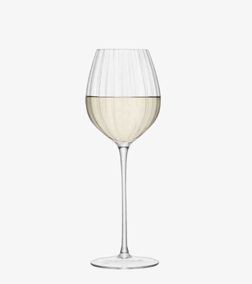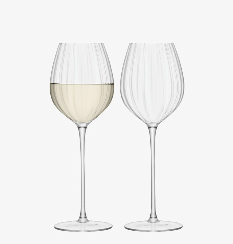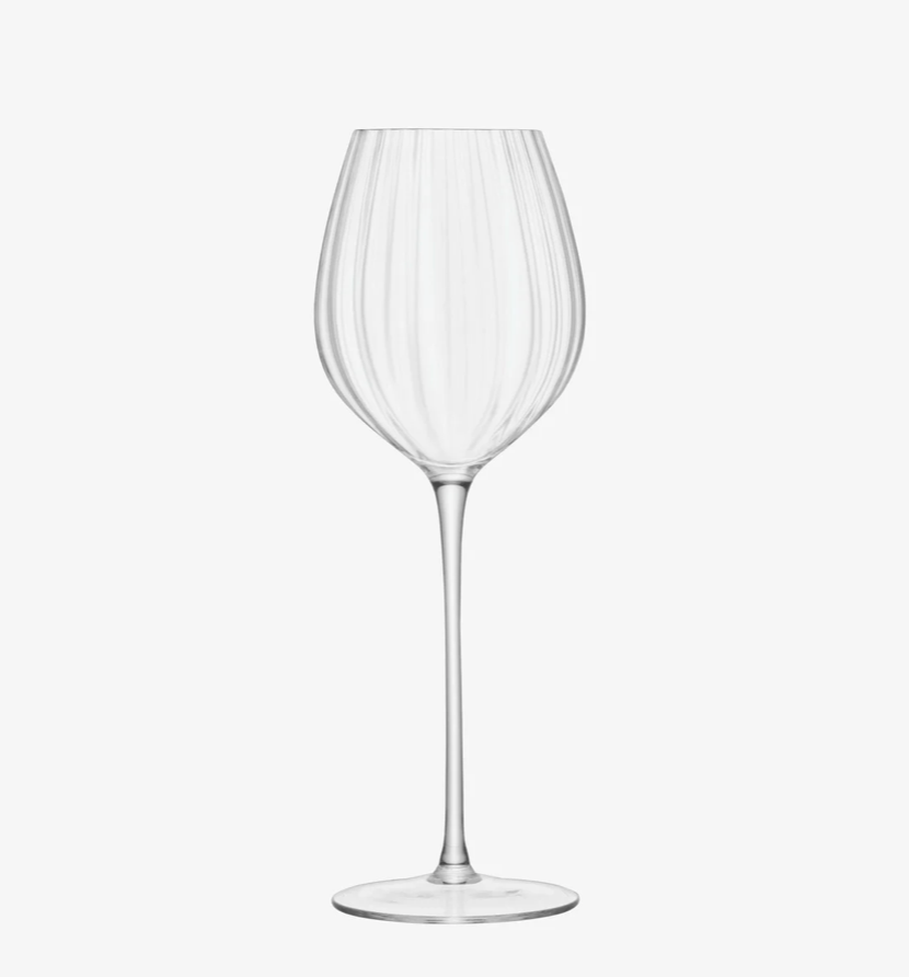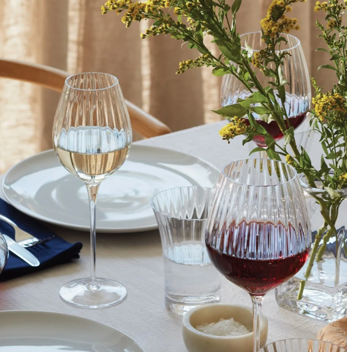 Mouth-blown wine glasses with finely-fluted bowls and long, hand-drawn stems.