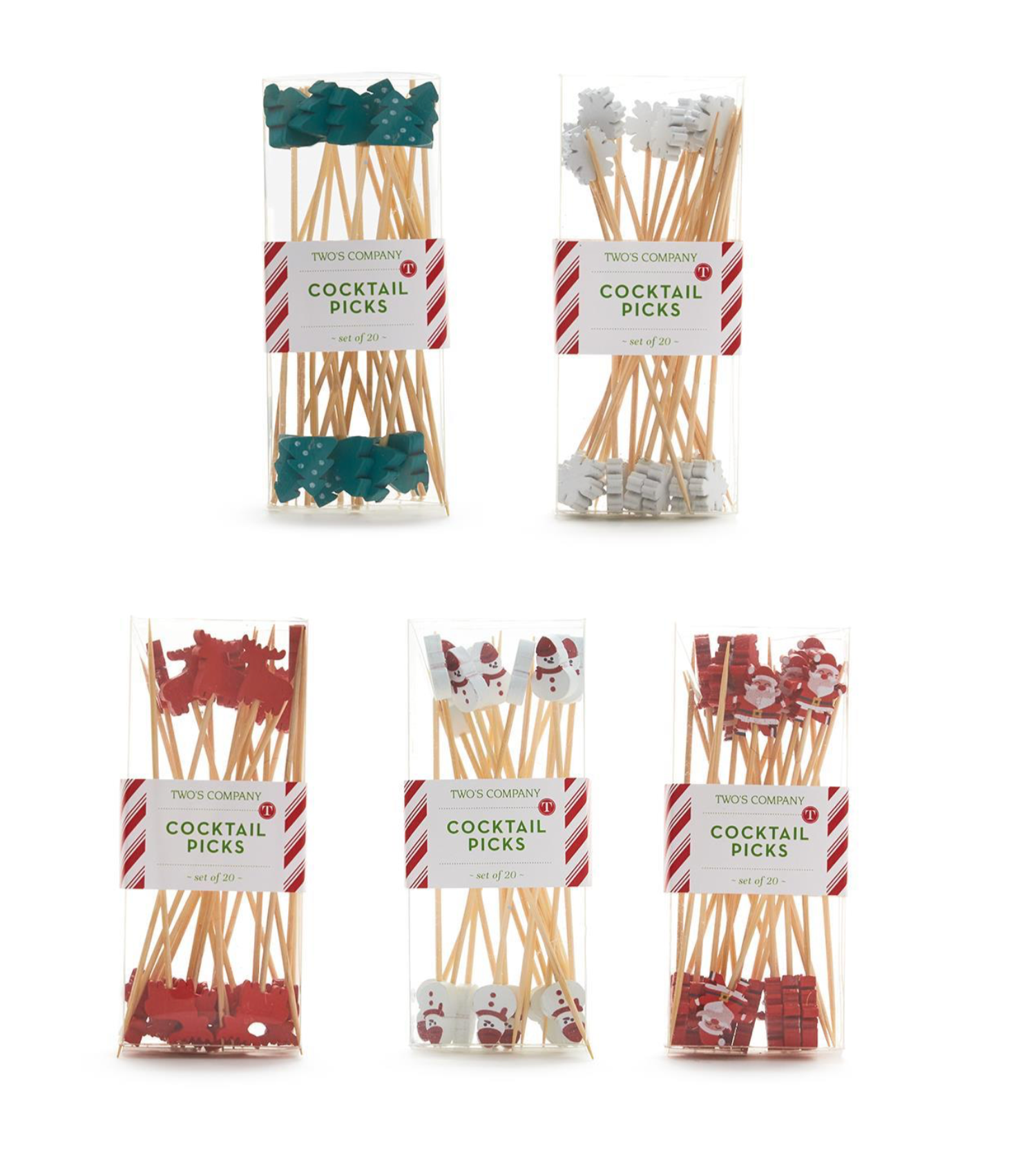 Add the finishing touch to your charcuterie board or hors d'oeuvre spread with these adorable holiday-themed picks. Crafted from bamboo, they feature 5 designs and include 20 picks per box: packed: 8 Pcs Tree style and 7 Pcs Santa, Snowflake, Deer, Snowman.