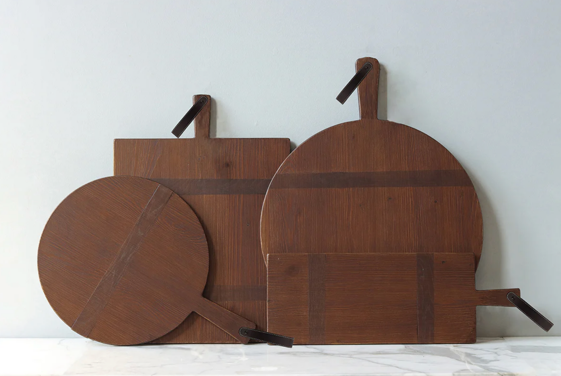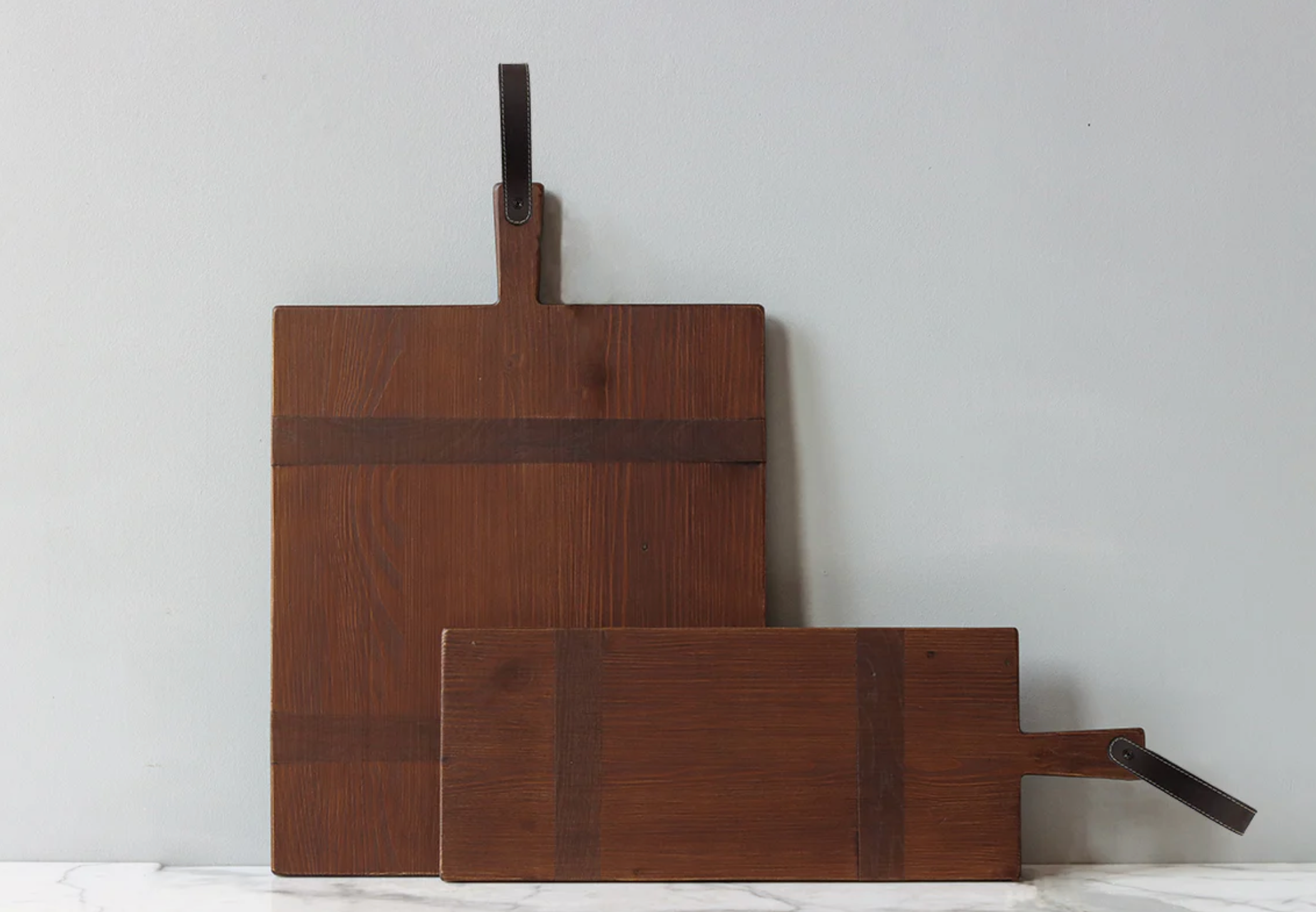 These reclaimed wooden boards are inspired by classically rooted concepts and have been updated for the modern home. The boards are finished with a rich saddle wax and are distinguished by a stitched, aged-leather strap to evoke an equestrian free-spirit. Versatile in the home, these boards can serve a charcuterie spread or be hung on the wall as elevated décor. The back of the board showcases the natural wood grain and intentional knife marks are created by a master craftsman to replicate the look of authentic originals.